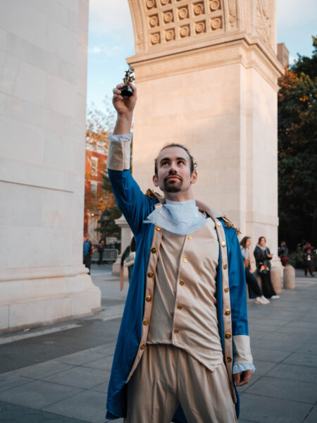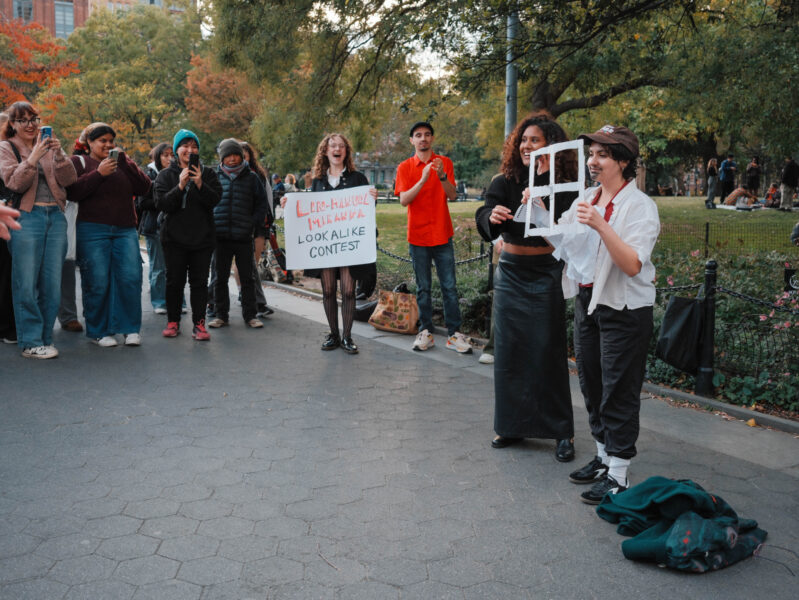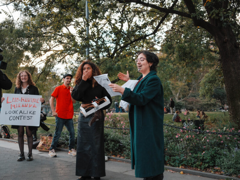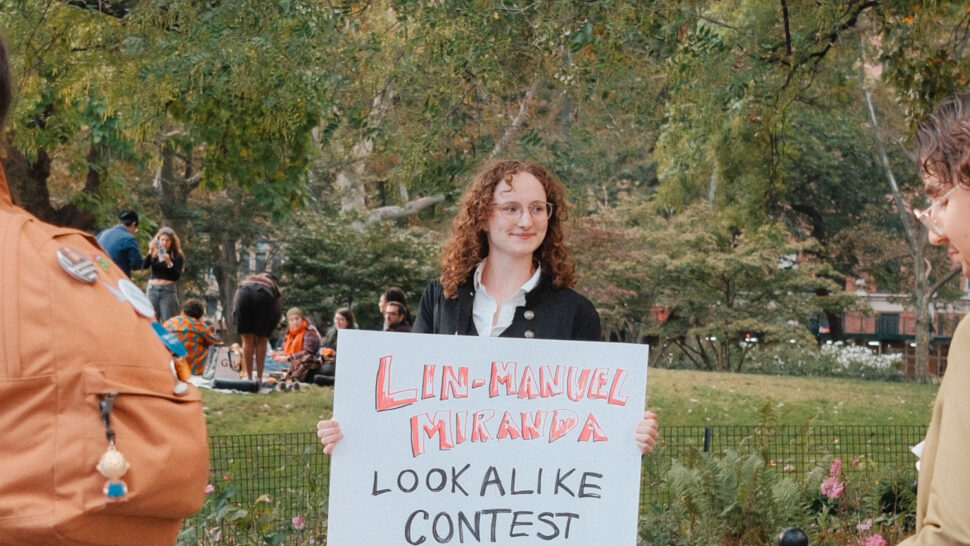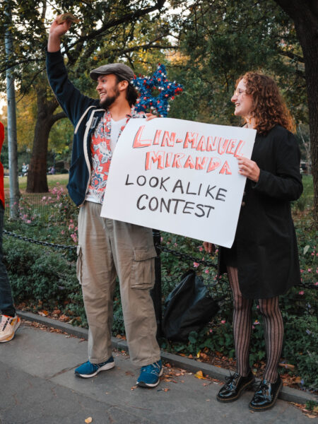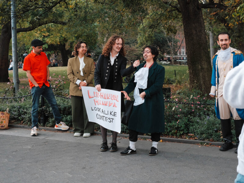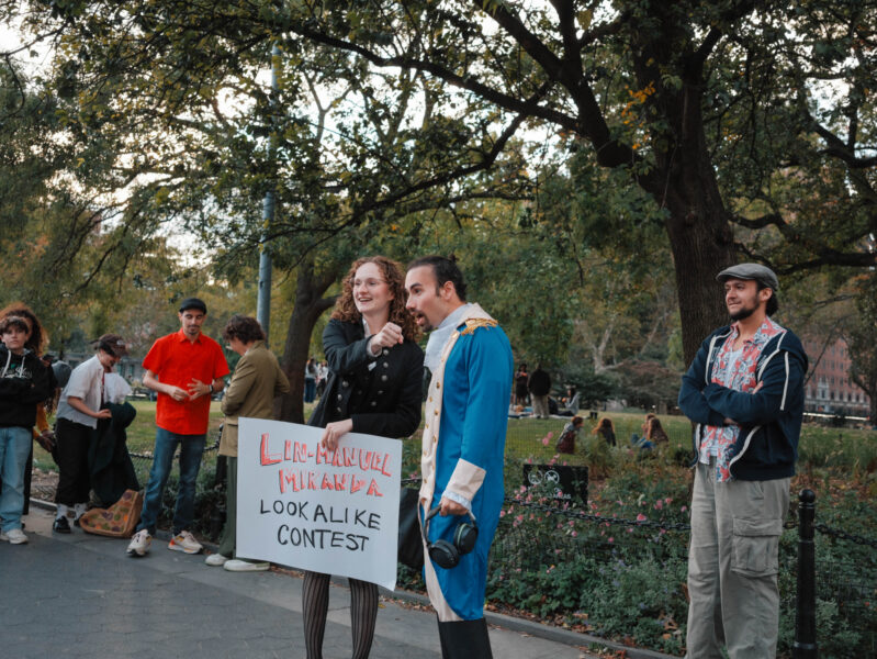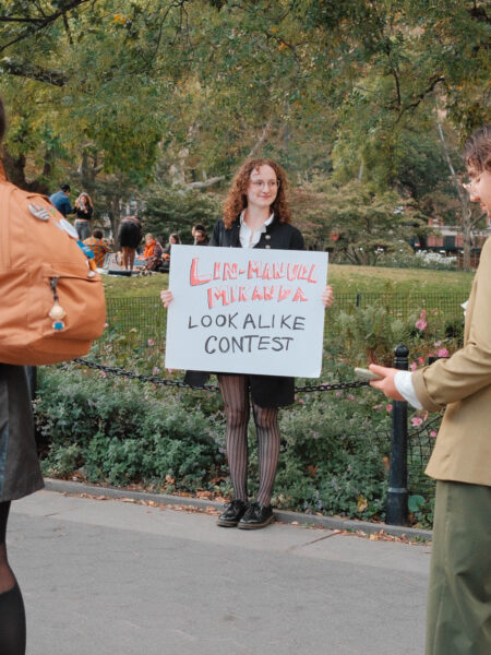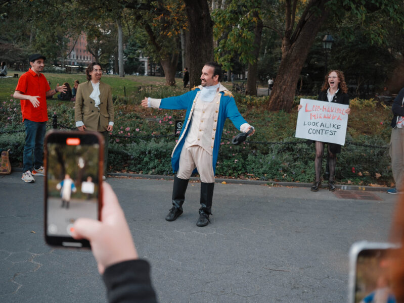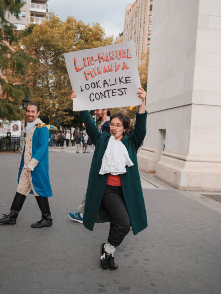 “You could’ve been anywhere in the world tonight, but you’re here with us at the Lin-Manuel Miranda Look-Alike Contest,” said Cate Bates on a brisk, but sunny, afternoon in Washington Square Park in New York City. That's right, on a random autumn Thursday, October 23, a few dozen people gathered in the park for a Lin-Manuel Miranda Look-Alike Contest. The winner got a trophy and a crisp $10 bill.