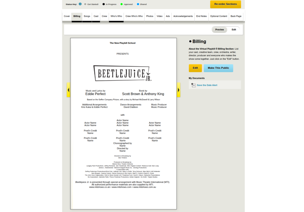 By simply selecting your show's title from the drop-down menu, you instantly bypass the manual labor, hence, saving you time! Once your show information is pre-loaded, you get to jump right into the fun part of adding cast photos, writing a witty director's note, selling ads to local businesses (a great way to build sustainable school theatre programs) and adding heartfelt acknowledgements. You're creating a professional, Broadway-caliber program with the speed of an express train!