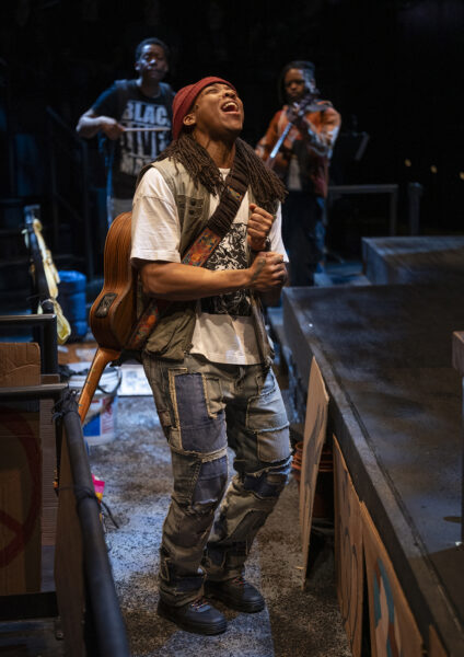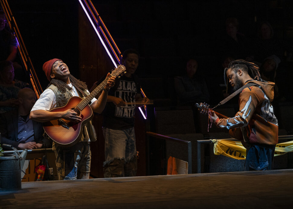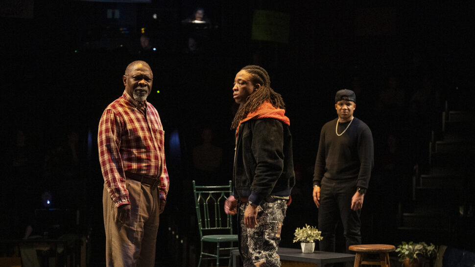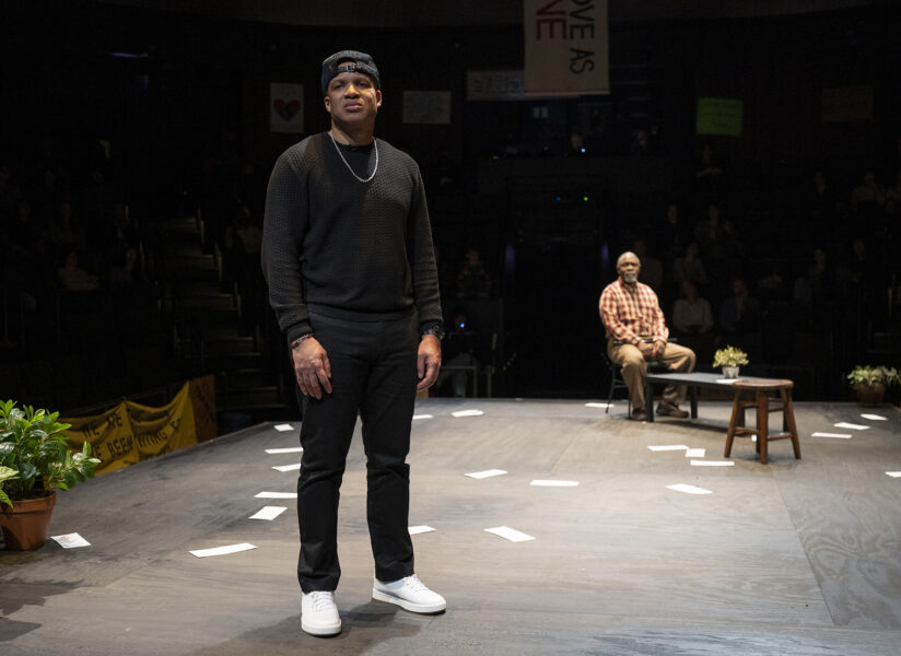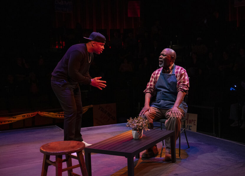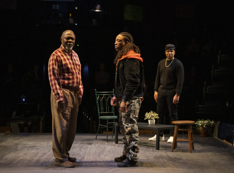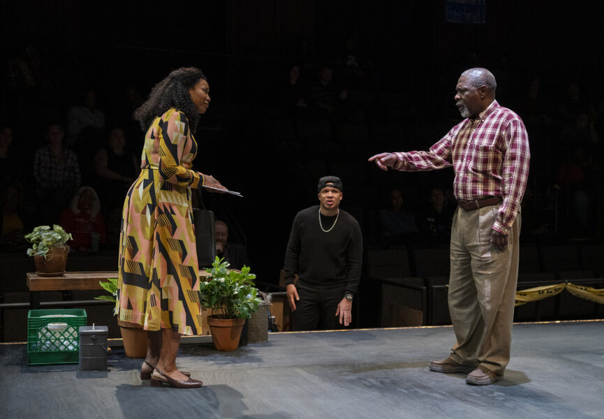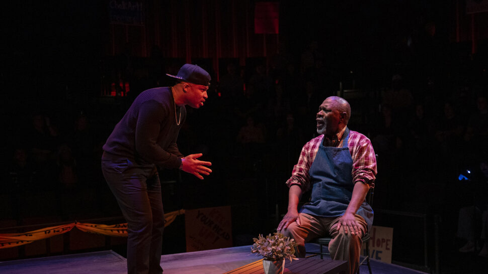 While many of his previous works are set in McCraney’s hometown of Miami or elsewhere in the southern United States, Windfall takes place in Chicago, where a Black father named Mr. Mano (Michael Potts) loses his youngest child to a police shooting. In response, the city offers him a large cash settlement, an amount that would propel him up the economic ladder yet provide cold comfort for such devastating grief. With the voices of his older child, Marcus (played by Davis), and three visiting strangers urging Mano to take the money, the play raises difficult questions about capitalism, justice, and the worth of Black bodies.
