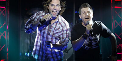 At Power Balladz, press notes state, "you can celebrate the best music of the '70s, '80s and '90s and liberate the rock star inside of you. The formula is simple: start with some blood-pumping arena rock songs by Motley Crue, Poison, Guns 'N' Roses, Journey and other kick-ass arena bands, add some talented rock singers, give them a full band, lots of lights, a fog machine, a video projection screen, plenty of leather and long hair, and you've got a concert, indeed an extravaganza. And while the Power Balladz band knows how to rock, the show takes an unexpected turn when the high school sweetheart of one of the musicians stumbles into the show after ten years apart, raising the question — will he be man enough to finally score the girl of his dreams?"
