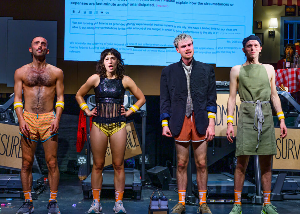 In Burnout Paradise, Pony Cam welcomes audiences with a simple question: can the four performers complete a dizzying array of challenges while collectively running 20 kilometers on treadmills before their time runs out? The four runners carry out a variety of absurd activities, from preparing a three-course meal, to washing their hair, to reciting Hamlet’s soliloquy, to walking the dog and picking up its poop, to writing and submitting an arts grant, and more. If they fail (and, they often do) they offer the audience their money back. Originating in Australia, the Parrot Ox–produced production previously played the Edinburgh Fringe.