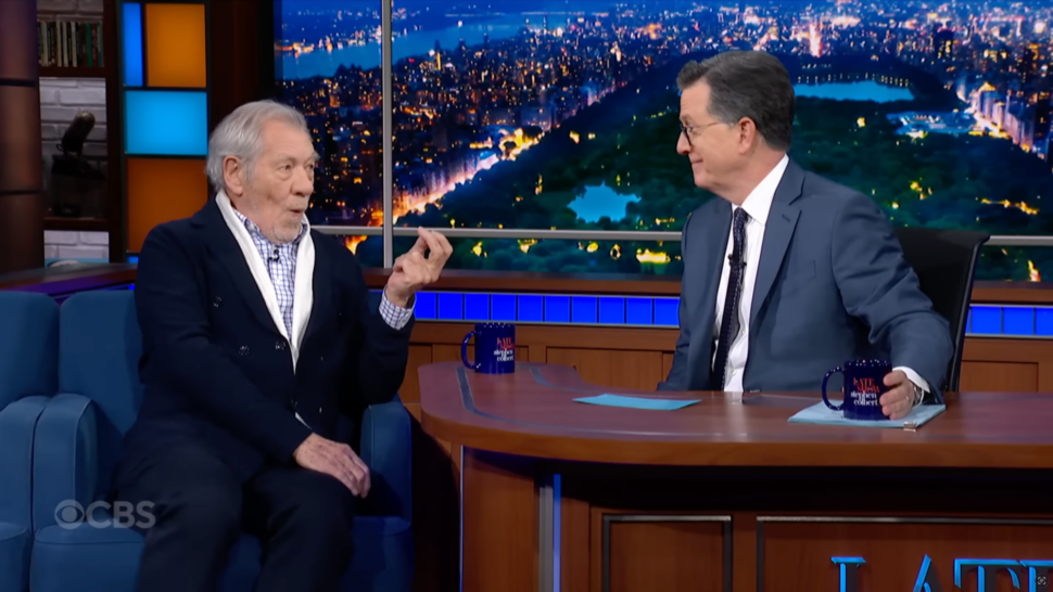 With that brief dramaturgy lesson, McKellen rises, delivering the speech with fiery intent, his gaze fierce as he stares down the barrel of the camera. By the end, the audience is uproariously on its feet as Colbert embraces McKellen with unshed tears in his eyes.