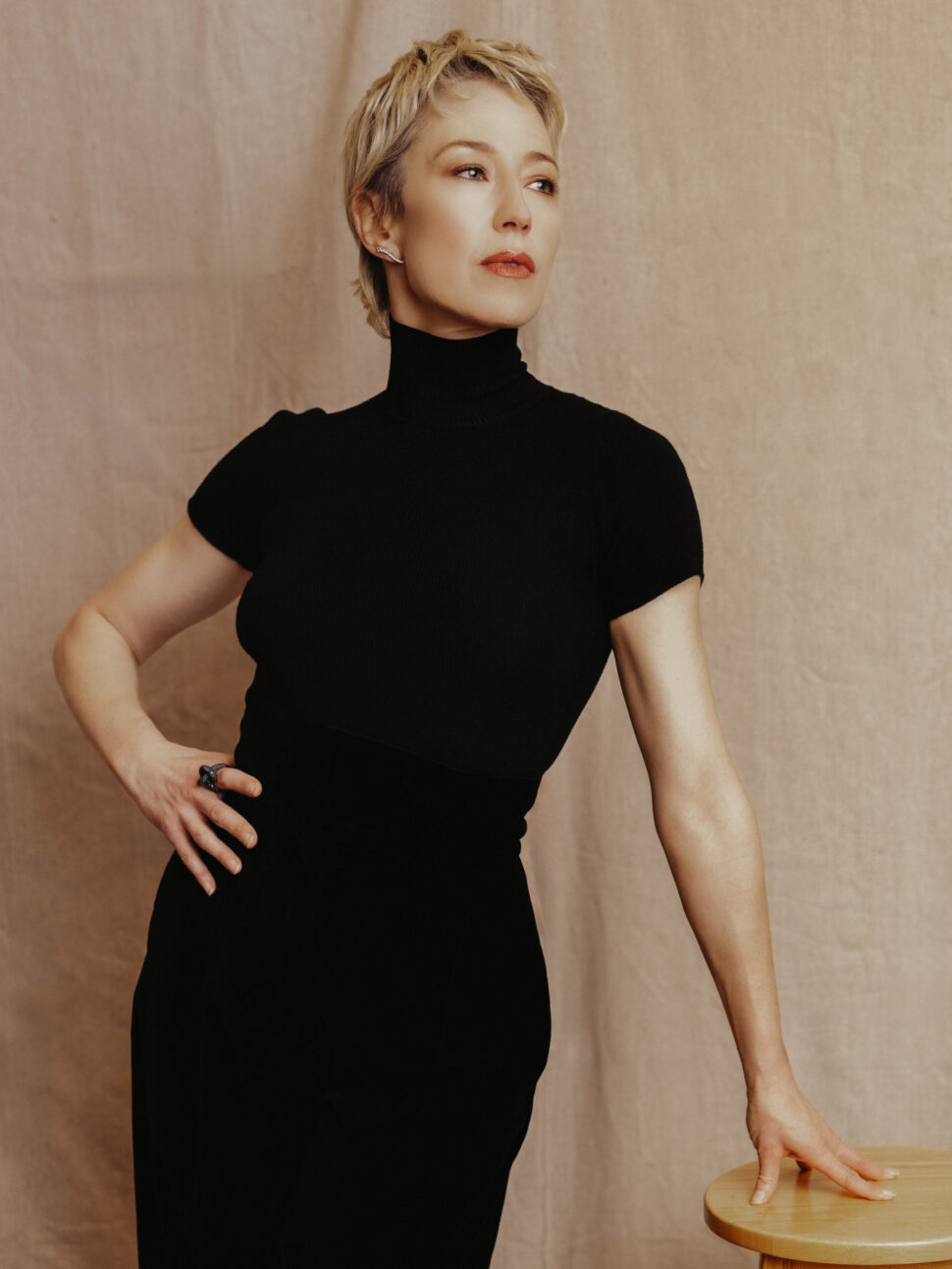 “Oh, man, it’s a real return to form,” Carrie Coon says of her short hair, which she sported throughout her childhood and young adulthood. It’s a sharp contrast to the long brunette locks of Bertha Russell, her character on HBO’s The Gilded Age. “It connects me to a kind of boyish, Puckish freedom. There’s something really anti-establishment about it too. I feel like everybody should be bringing a little bit of ‘fuck you’ into all their spaces right now.”