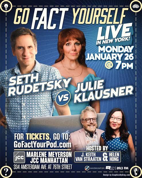 Back to snow: I’m obsessed with blizzards, tornados, hurricanes, and all kinds of natural disasters. As a matter of fact, that is one of the categories I submitted to the podcast, Go Fact Yourself. They reached out to me and asked me to be one of the two guests during their filming in NYC on January 26. The show is hosted by Helen Hong and moderated by J. Keith Van Straaten. The format consists of two “opponents” who are quizzed in areas they claim they are experts in that aren’t part of their professional field. When they asked me for possible categories, I wracked my brain. I only know Broadway!